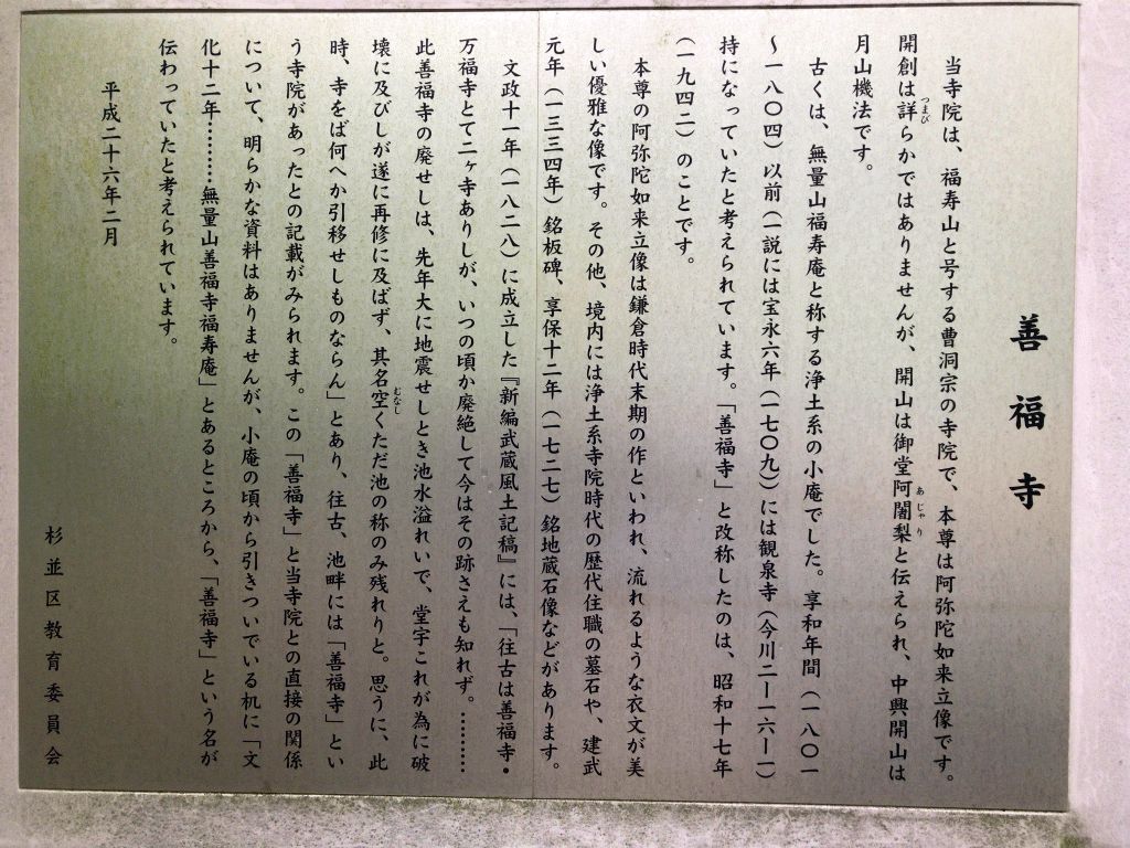 宝珠山観泉寺 曹洞宗寺院 今川氏と観泉寺の関係は、この説明板に書いてあるとおり。 三門 庭園 滝もある 墓地へ入ると六地蔵を上回るお地蔵さんが並ぶ。 今川氏の墓所 本堂 閻魔堂 鐘楼 ミニ竹林 駐車場への車両用道路 観泉寺・善福寺と路傍の石造物 観泉寺の石造物 三門手前西側 なんと言っても、この猫の供養塔が目につく。 左端は地蔵坂の馬頭観音 左下に並んだ石造物の説明碑 三猿が昔のSF映画の宇宙人みたい 三門手前東側 如意輪観音の比率が高い 善福寺の石造物 子育て地蔵? へたれ怪獣 個性的な顔に惹かれる。 路傍の石造物 井草八幡前交差点 江戸向き地蔵 江戸から西へ向かう人達の安全を護るということだろう。 三山百番+羽黒三山の記念碑 立野橋交差点
